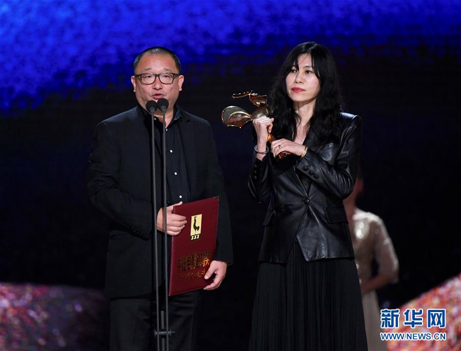 11月23日,電影《地久天長》獲得最佳編劇獎,導演兼編劇王小帥(左)、編劇阿美在頒獎儀式上。 當日,第32屆中國電影金雞獎頒獎典禮在福建廈門舉行。 新華社記者姜克紅攝