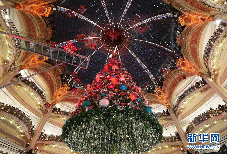 這是11月24日在法國(guó)巴黎老佛爺百貨公司拍攝的點(diǎn)燈后的巨型圣誕樹(shù)。 新華社記者高靜攝