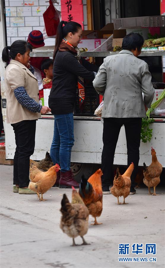 在鹿寨縣拉溝鄉(xiāng)木龍村,李柳萍(右二)在采購鄉(xiāng)村土特產(chǎn)(12月14日攝)。新華社記者黃孝邦攝
