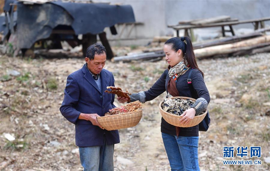 在鹿寨縣拉溝鄉(xiāng)木龍村,李柳萍(右)到五保戶李建文家收購木耳、干筍等(12月14日攝)。新華社記者黃孝邦攝