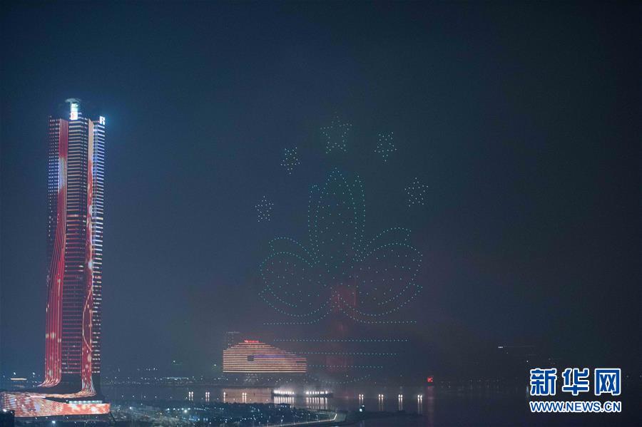 12月22日拍攝的煙花匯演上的無人機表演。當(dāng)晚,澳門與珠海首次聯(lián)合舉行煙花匯演,慶祝澳門回歸祖國20周年。新華社記者張金加攝