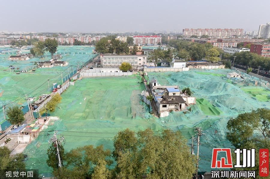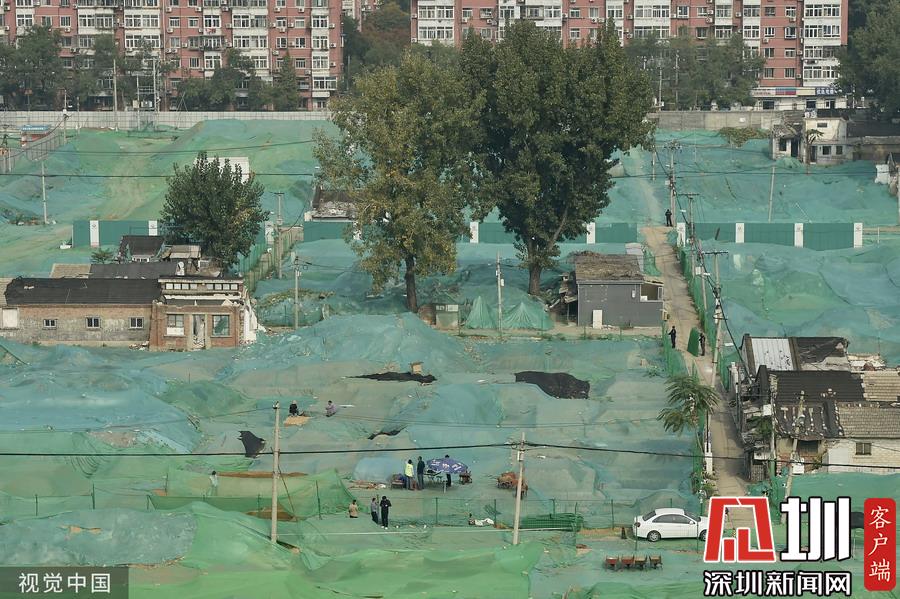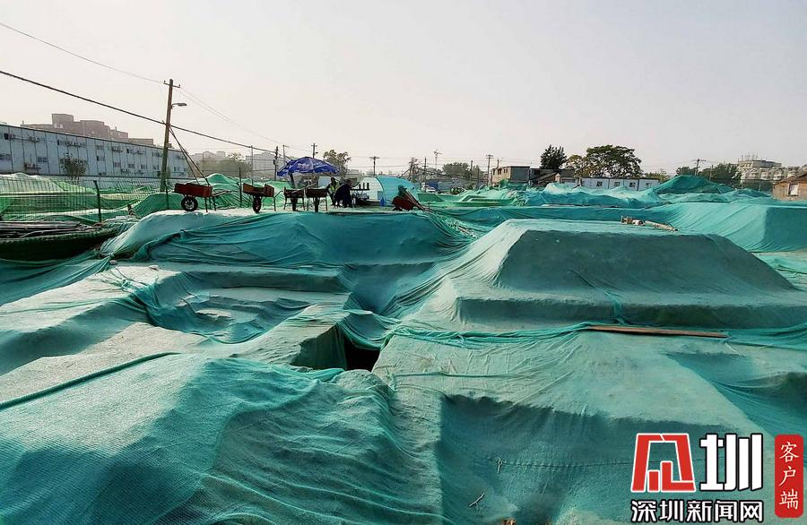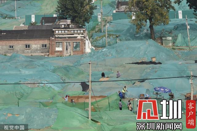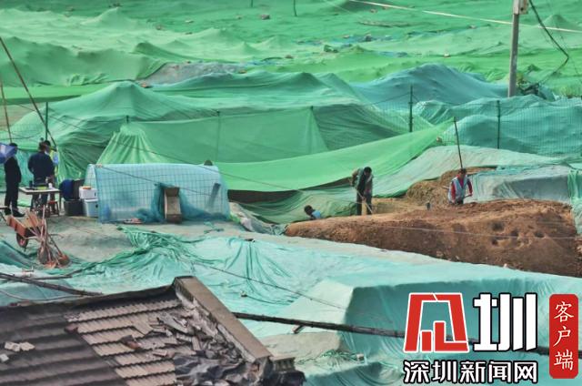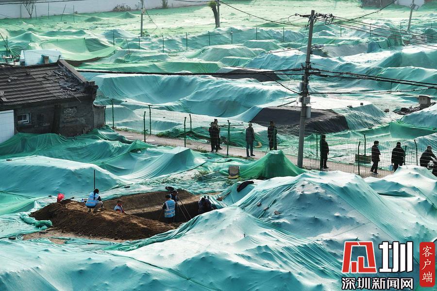 圍擋內(nèi),工地大部分被綠色苫布覆蓋,只露出幾處規(guī)整的探坑??脊殴ぷ髡哒诰o張忙碌中,有些工作人員戴著草帽,坐在馬扎上記錄發(fā)掘細節(jié),還有一些穿著藍色背心的工作人員使用工具正在做清理工作。
