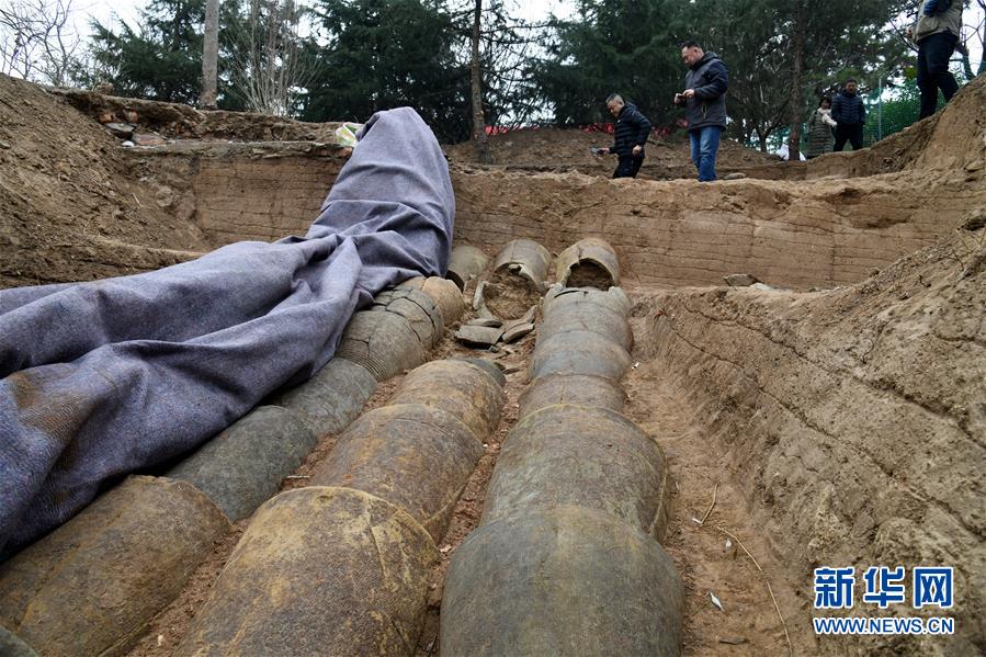 12月21日拍攝的瑯琊臺遺址考古發(fā)掘現(xiàn)場。三組整齊的陶制管道規(guī)整排列,管道較粗,管壁較厚,陶水管為兩端大小各異的標準件,與現(xiàn)代城市地下排水管件類似。新華社記者李紫恒攝