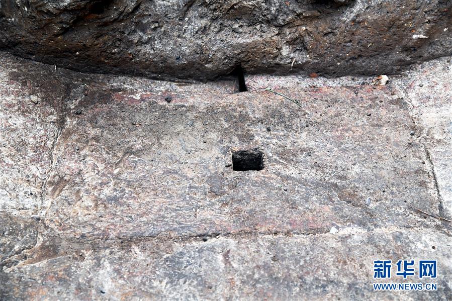 在瑯琊臺遺址考古發(fā)掘現(xiàn)場拍攝的秦漢時期的石砌地漏,六方大小石塊斜面壘砌,中間的石塊開有方形小孔。根據(jù)地漏的形狀和制作的精細程度,可以初步判斷它應(yīng)該用于室內(nèi)排水(12月21日攝)。新華社記者李紫恒攝