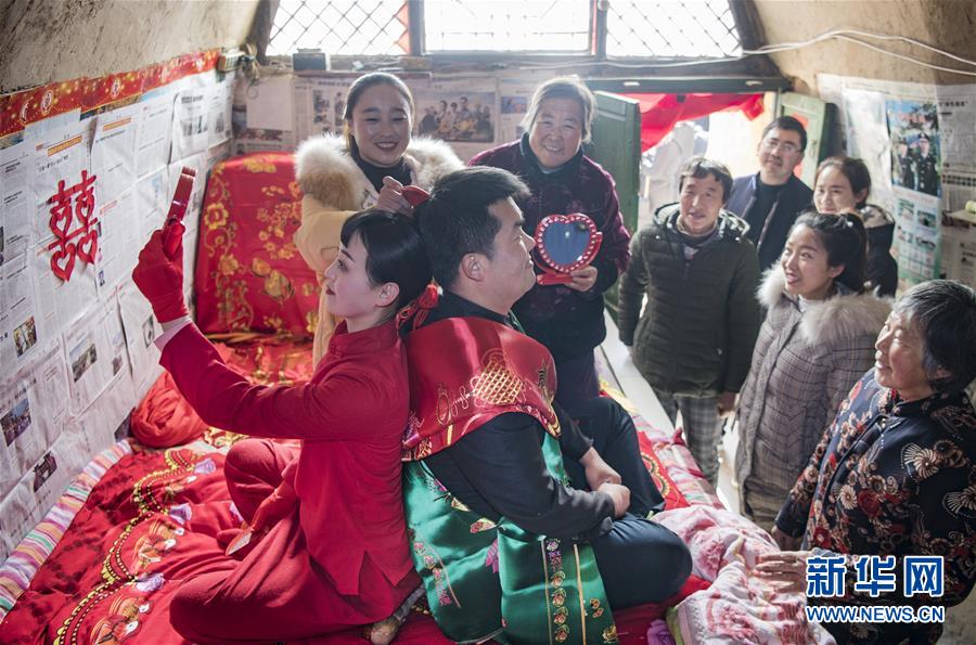 12月18日,在志丹縣金丁鎮(zhèn)謝灣村舉行的一場(chǎng)陜北婚俗表演中,鄉(xiāng)親們?yōu)椤靶氯恕笔崂?。這是婚俗中的“并頭”環(huán)節(jié)。