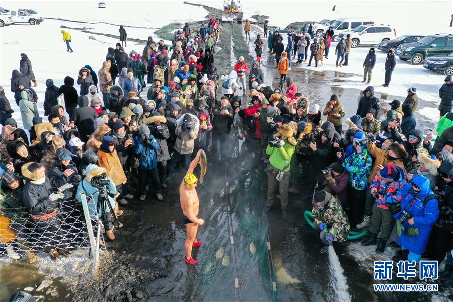 12月18日,一名冬泳愛好者展示冬捕魚(無人機拍攝)。 當日,位于內蒙古呼倫貝爾大草原上的諾干湖舉行冬捕活動,吸引不少游客前來觀看。冬日的諾干湖冰雪覆蓋,諾干湖冬捕也是當?shù)囟韭糜蔚奶厣顒又弧?新華社記者 劉磊 攝