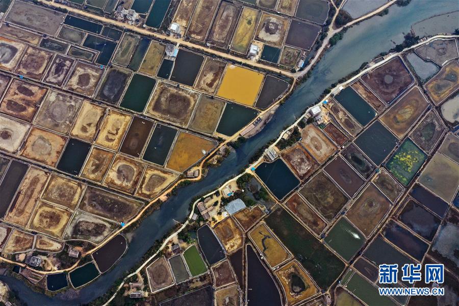 12月21日無人機(jī)拍攝的廣西合浦縣黨江鎮(zhèn)更螺圍出海口的蝦塘。冬日,廣西廉州灣海域風(fēng)光別致。新華社記者張愛林?jǐn)z
