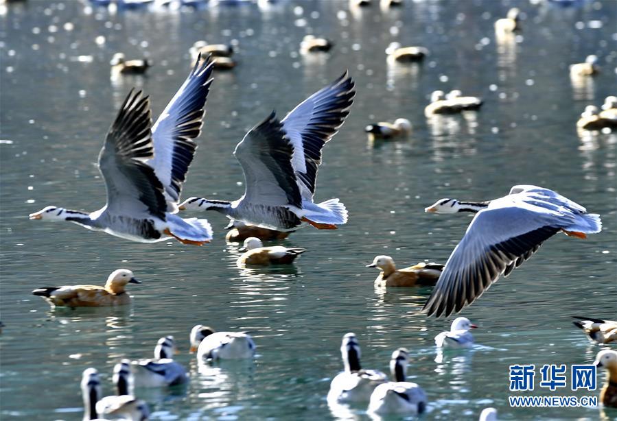 三只斑頭雁在龍王潭公園的水面上飛行(12月20日攝)。新華社記者張汝鋒攝