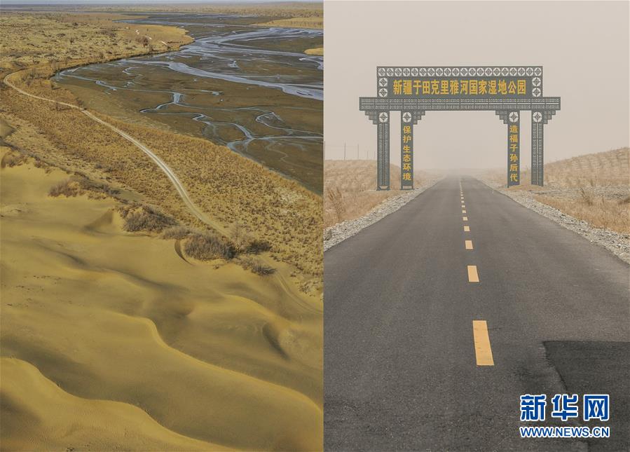 拼版照片:左圖為沿著克里雅河通向地處沙漠深處新疆于田縣達(dá)里雅布依鄉(xiāng)的路(3月19日無人機(jī)拍攝);右圖為從縣城通往達(dá)里雅布依小鎮(zhèn)易地扶貧安置點(diǎn)的柏油路(3月20日攝)。新華社記者胡虎虎攝