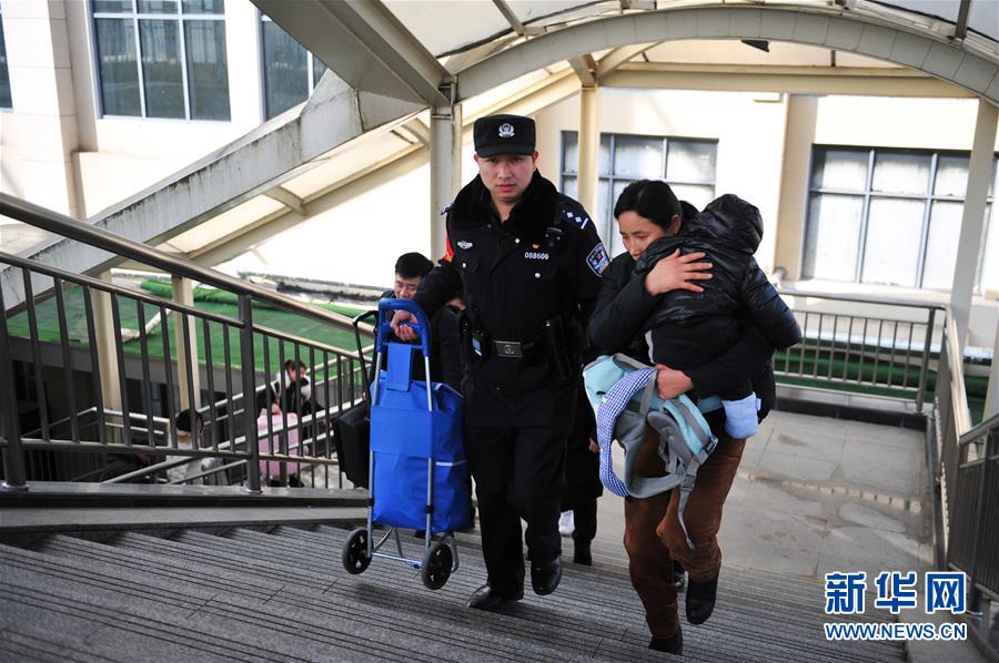 金寨火車站派出所民警何津超(前左)幫助旅客搬運行李(12月19日攝)。新華社記者鄧堅攝