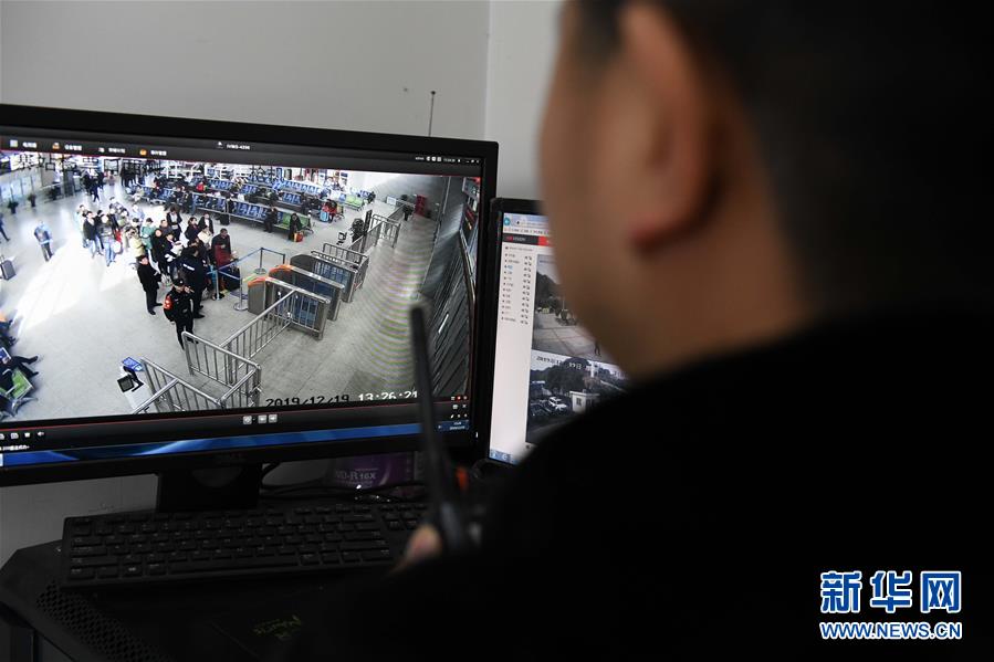 金寨火車站派出所民警何津超通過監(jiān)控視頻了解候車大廳內的實時情況(12月19日攝)。新華社記者張端攝