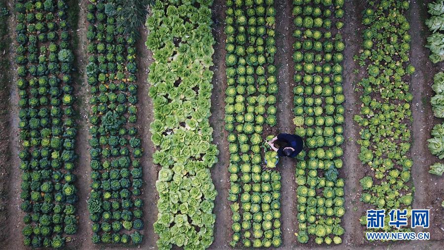 金寨火車站派出所民警呂錦鵬在菜園摘菜(12月19日無人機(jī)拍攝)。由于金寨火車站派出所離縣城較遠(yuǎn),平時(shí)買菜不方便,民警們?cè)谠鹤永镩_墾了一處小菜園。新華社記者張端攝