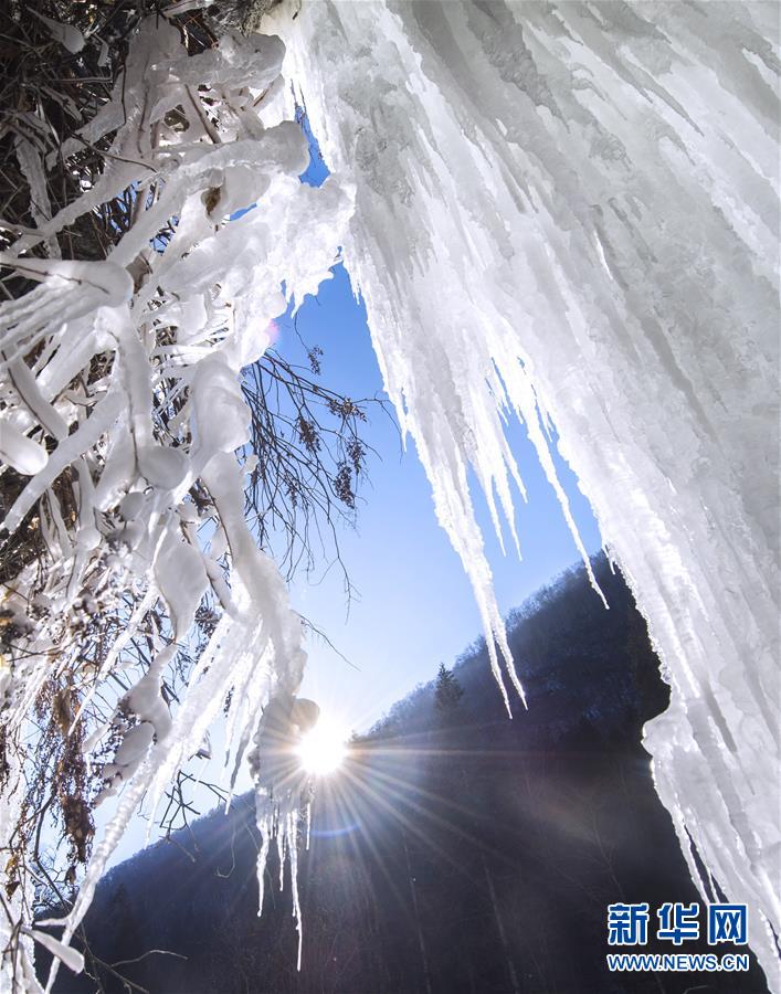 這是在吉林省長白縣十五道溝望天鵝景區(qū)拍攝的懸于石壁間的冰凌(1月3日攝)。新華社記者許暢攝