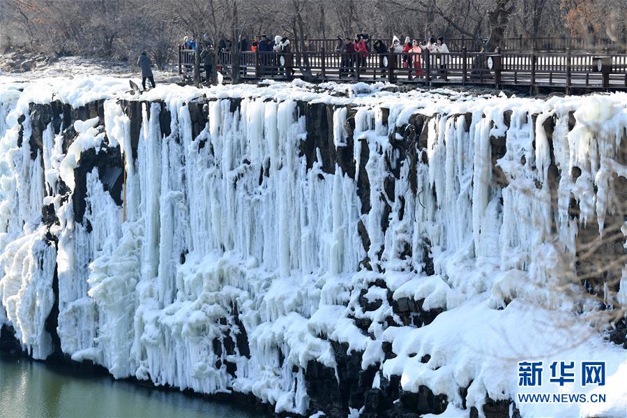 2月25日,游客在觀賞冰瀑景觀。去冬今春以來,黑龍江省鏡泊湖的吊水樓冰瀑景色壯觀,吸引許多游人前來觀賞。新華社記者王建威攝