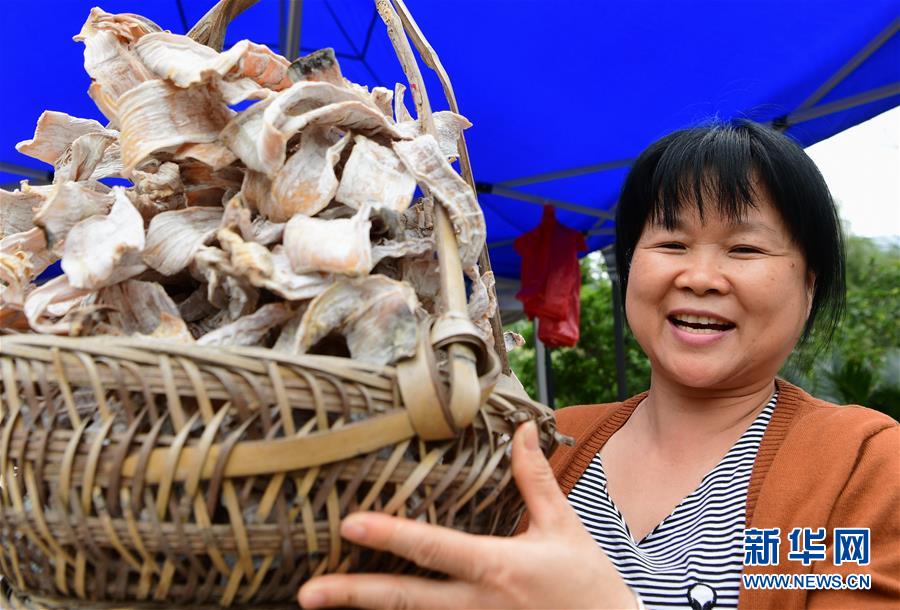 在龍巖市永定區(qū)湖坑鎮(zhèn)南江村停車場,村民王贈(zèng)娘展示自己生產(chǎn)的筍干。從事涉旅行業(yè)后,她的年收入從原來的七八萬元增加到20多萬元(5月4日攝)。新華社記者魏培全攝