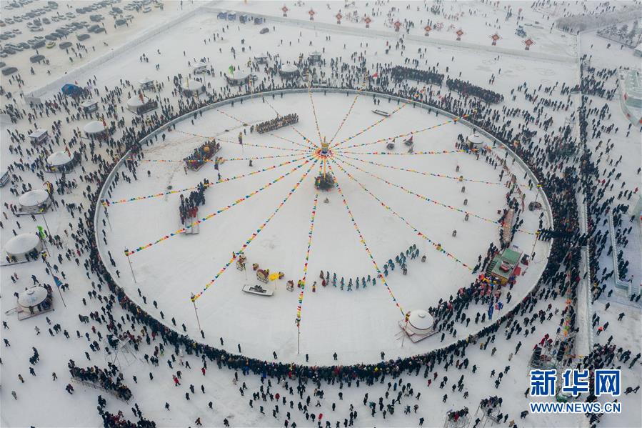 12月28日無(wú)人機(jī)拍攝的查干湖第十八屆冰雪漁獵文化旅游節(jié)開(kāi)幕式現(xiàn)場(chǎng)。