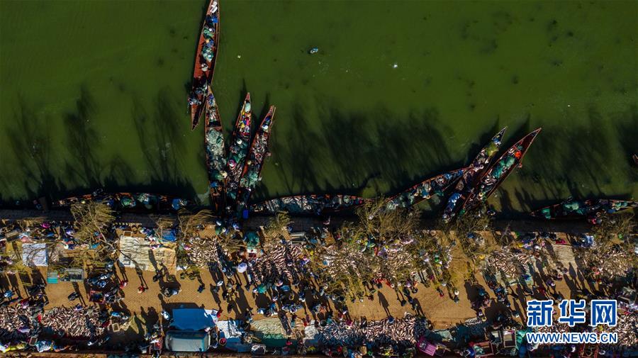星云湖畔的老河咀魚市熱鬧非凡(12月25日無人機(jī)拍攝)。新華社記者胡超攝