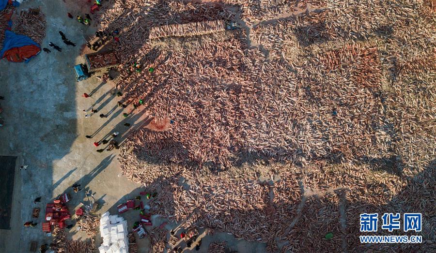 12月27日,在吉林松原查干湖漁場(chǎng),工人們將魚(yú)裝箱(無(wú)人機(jī)拍攝)。新華社記者張楠攝