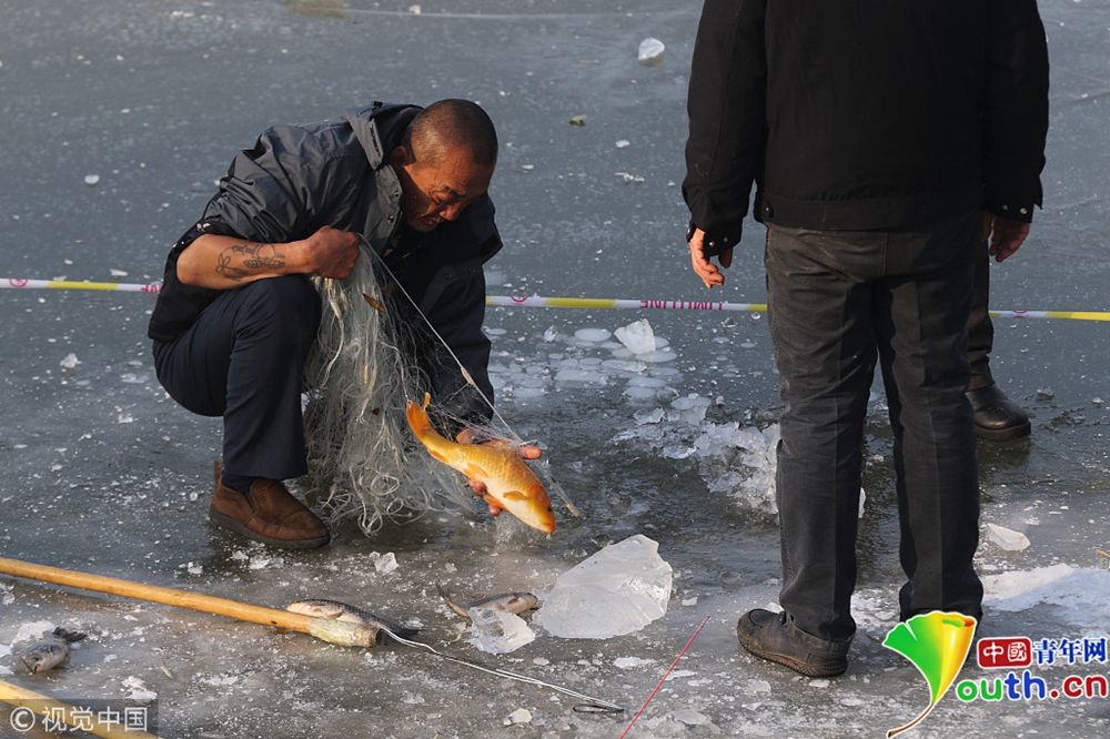 2018年11月25日,黑龍江省哈爾濱市,松花江封江不久,已經(jīng)有人蹬江鑿冰下網(wǎng)捕魚。圖片來源:視覺中國