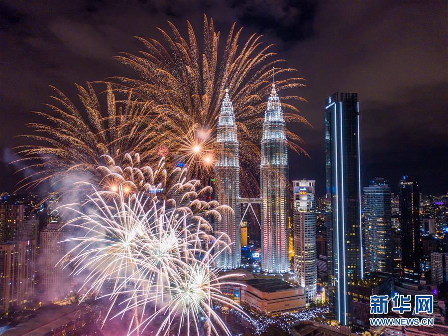 2020年1月1日,焰火在馬來西亞吉隆坡的馬來西亞國家石油公司雙塔旁綻放,迎接新年的到來。新華社記者朱煒攝