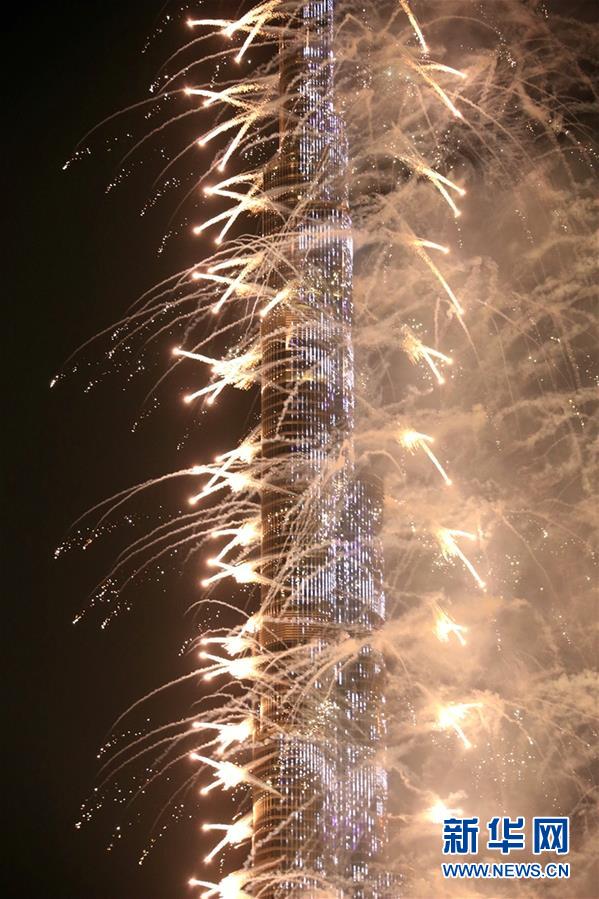 這是2020年1月1日拍攝的阿聯(lián)酋迪拜哈利法塔跨年煙火表演。新華社記者蘇小坡攝