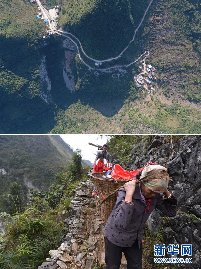 拼版照片:上圖為已經(jīng)修通水泥路的大化瑤族自治縣板升鄉(xiāng)八好村八好屯(11月11日無(wú)人機(jī)拍攝);下圖為在尚未通路的八好村八好屯,村民背著年貨走山路回家(2016年1月26日攝)。新華社記者黃孝邦攝