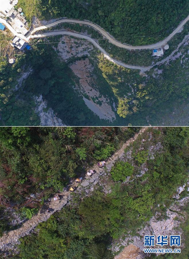 拼版照片:上圖為已經(jīng)修通水泥路的大化瑤族自治縣板升鄉(xiāng)八好村八好屯(11月11日無人機(jī)拍攝);下圖為在尚未通路的八好村八好屯,村民背著化肥走山路回家(2016年4月15日攝)。新華社記者黃孝邦攝