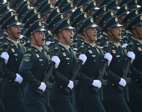 2019年10月1日,慶祝中華人民共和國成立70周年大會在北京天安門廣場隆重舉行。這是女兵方隊接受檢閱。新華社記者王毓國攝