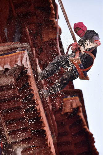 2019年11月1日,在西藏拉薩市布達(dá)拉宮,施工人員給墻體噴灑涂料。當(dāng)日,布達(dá)拉宮每年一度的墻體粉刷工程正式啟動(dòng),這也是布達(dá)拉宮例行的“年度美容”。新華社記者覺果攝
