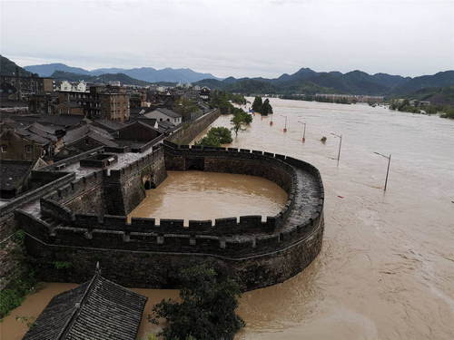 2019年8月,超強(qiáng)臺(tái)風(fēng)“利奇馬”引發(fā)的洪水圍困浙江省臨海市。這是8月10日拍攝的被洪水圍困的臨海古城(無人機(jī)照片)。新華社發(fā)