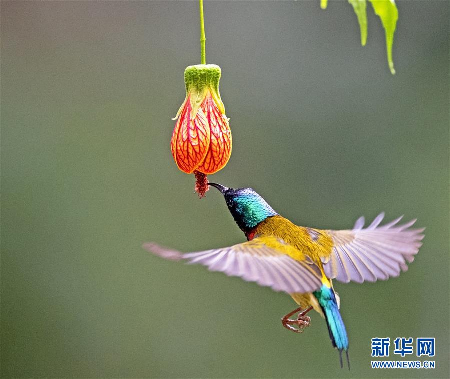 在福州市西湖公園,一只叉尾太陽(yáng)鳥(niǎo)在狀如燈籠的懸鈴花前懸停、采蜜(1月3日攝)。 新華社記者梅永存攝