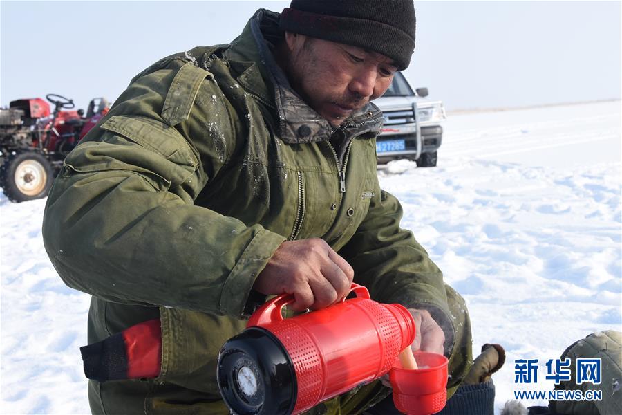 新疆福??h漁民在冬捕間歇喝奶茶(1月5日攝)。新華社記者張曉龍攝