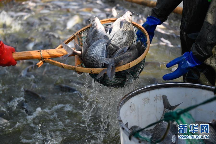 12月18日,一名工作人員將捕撈上來的魚放入筐中。新華社記者劉磊攝