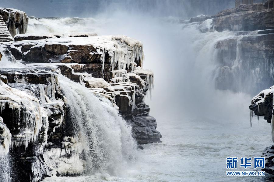1月12日,黃河壺口瀑布景區(qū)內(nèi)的冰瀑與流動(dòng)的瀑布形成一幅獨(dú)特的景觀。新華社記者陶明攝
