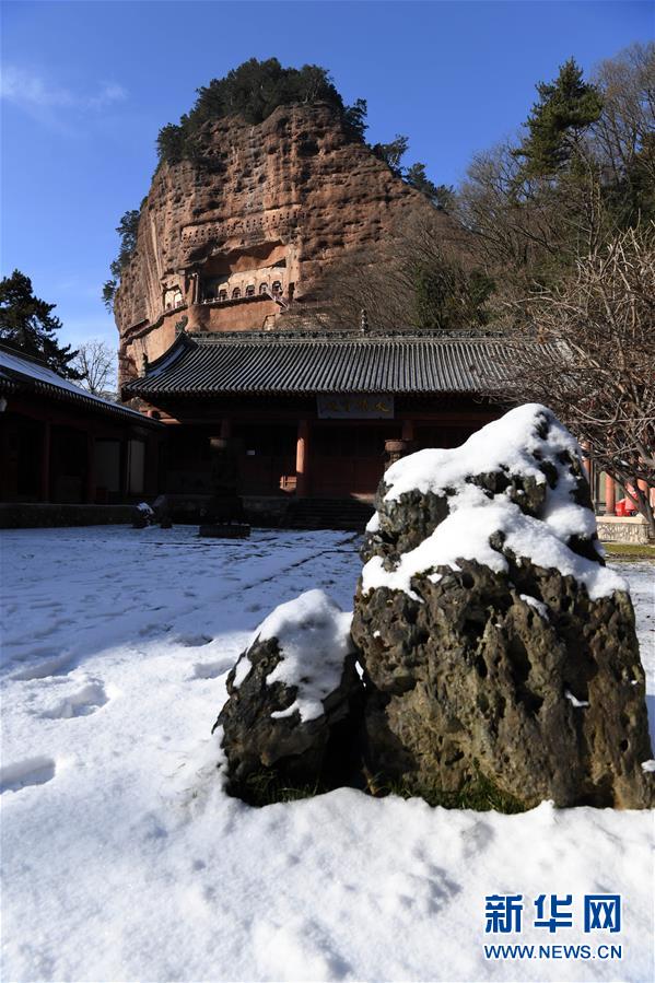 12月26日拍攝的雪后晴空下的麥積山石窟。新華社記者馬寧攝