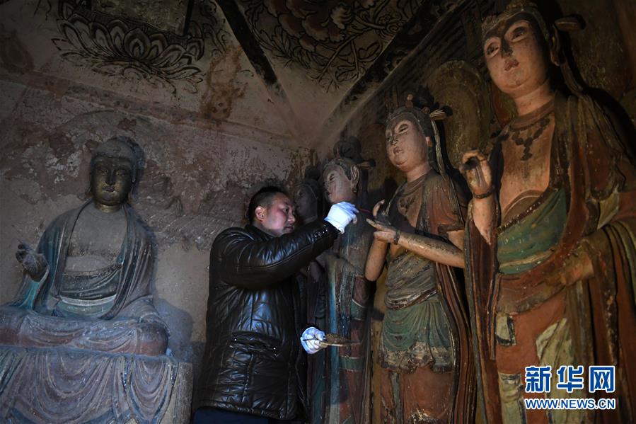 12月25日,在麥積山石窟第11窟,修復師牟常有對塑像破損處進行加固處理。