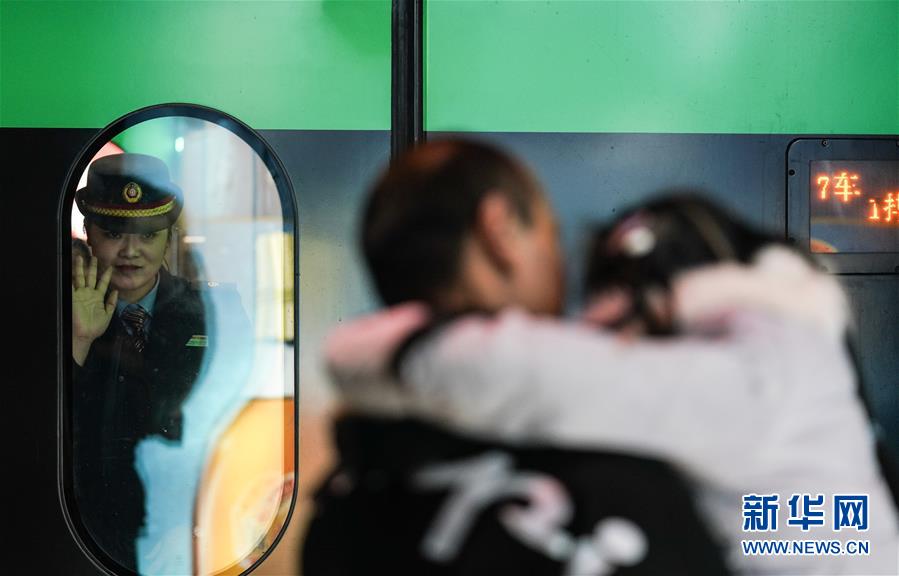 1月3日,列車即將離開南昌西站,車內(nèi)的卞菁(左)向丈夫和女兒告別。新華社記者 胡晨歡 攝