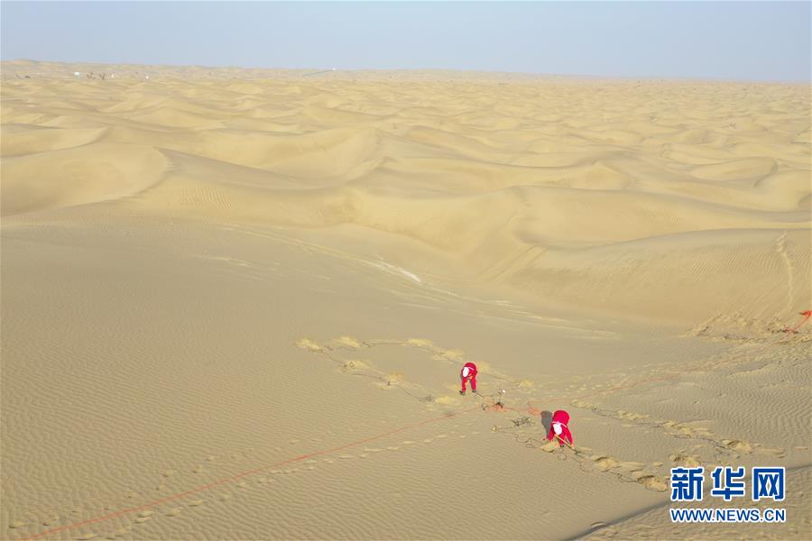 放線女工在塔克拉瑪干沙漠腹地進(jìn)行放線工作(無人機(jī)照片,1月14日攝)。