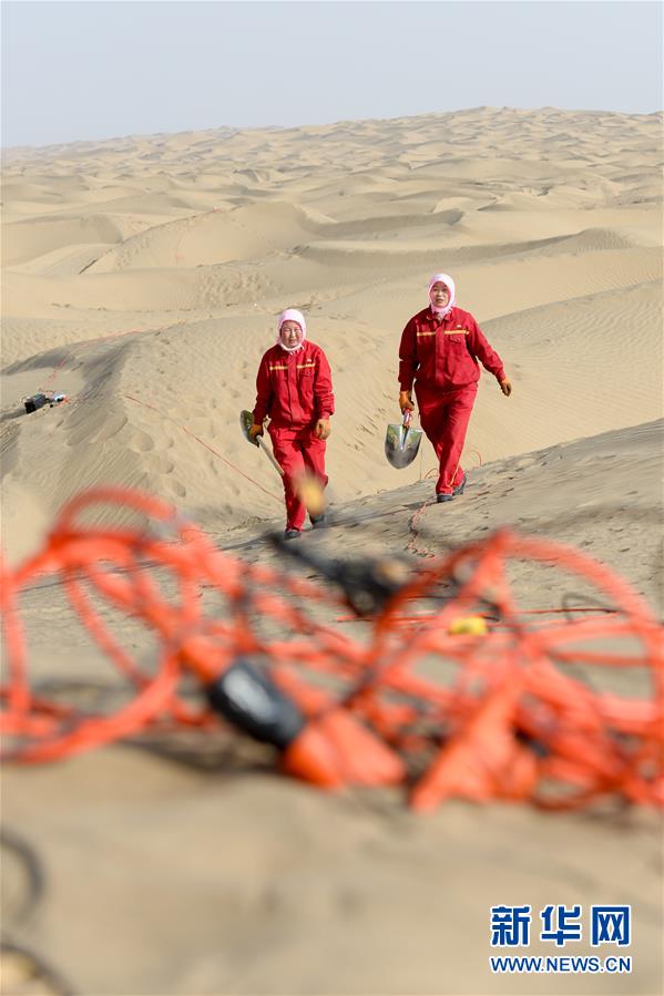 放線工張進(jìn)秀(右)和陳莉云翻越沙丘進(jìn)行放線工作(1月14日攝)。新華社記者 丁磊 攝