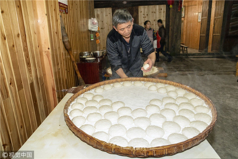 重慶江津區(qū)中山古鎮(zhèn)第十四屆 “千米長(zhǎng)宴”民俗文化節(jié)盛大啟幕。上午10時(shí),中山古鎮(zhèn)老街人聲鼎沸,窄窄的青石板路打掃得干干凈凈,家家戶(hù)戶(hù)門(mén)口掛起喜慶的紅燈籠,老商鋪門(mén)口擺滿(mǎn)了米酒、烤糍粑、煙熏豆腐……此次“千米長(zhǎng)宴”以“絲路情緣,‘?!现猩健睘橹黝}?!扒组L(zhǎng)宴”期間,游客們不僅可以一雙筷子吃遍全街,還可欣賞到祈福祭祀、民俗拜年、“打盆上菜”等表演,同時(shí)還增設(shè)了以唱、跳、講故事的上菜方式情景演繹愛(ài)情主題的文化餐飲,展示富硒愛(ài)情宴的文化內(nèi)涵。圖為街坊們?cè)陬^天就開(kāi)始準(zhǔn)備各種菜肴與小吃。