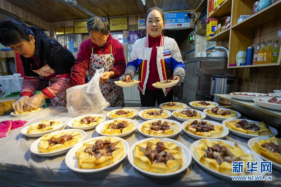 1月18日,中山古鎮(zhèn)的一戶商家在“千米長(zhǎng)宴”開席前準(zhǔn)備菜品。新華社記者劉潺攝