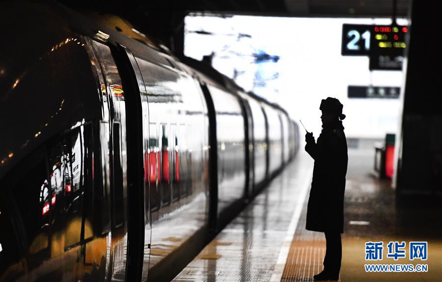 吉如在西安北站站臺上,與檢票口客運人員聯(lián)控(1月14日攝)。今年春運列車開行密度大,站臺崗位人員緊張,吉如時常被調(diào)到站臺進行站臺服務(wù)工作。新華社記者陶明攝