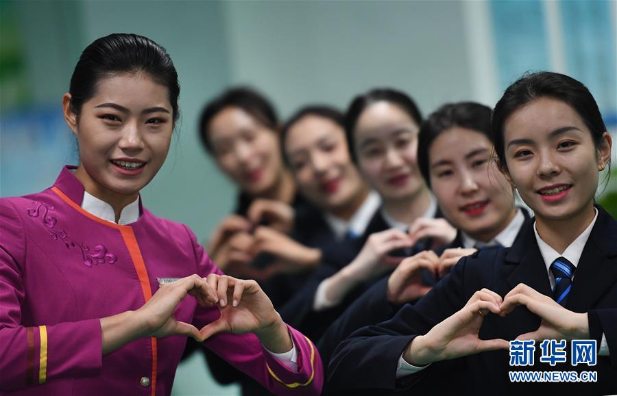 吉如(后左一)在車站職工活動室指導(dǎo)同事禮儀訓(xùn)練(1月15日攝)。新華社記者陶明攝