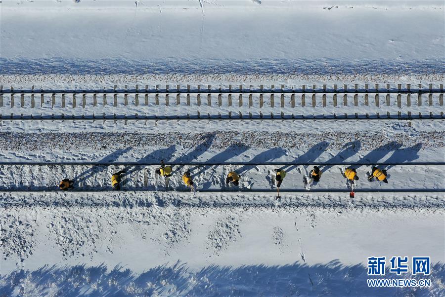 1月13日,白音庫倫綜合維修車間職工在作業(yè)點清理積雪(無人機照片)。新華社記者劉磊攝