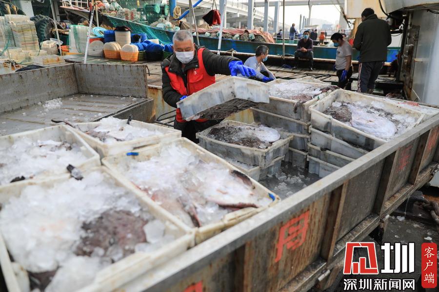 2020年2月24日,浙江舟山國際水產(chǎn)城碼頭,當(dāng)?shù)氐墓と苏趧偪堪兜臐O船上卸魚貨,現(xiàn)場十分繁忙。