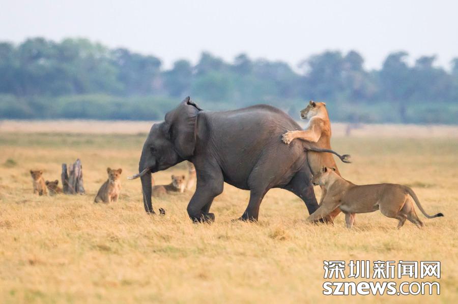 英國攝影師詹姆斯(James Gifford)在博茨瓦納喬貝國家公園拍到一群獅子獵食大象的精彩畫面。在詹姆斯的鏡頭下,一頭母獅跳到了一頭小象的背上想要將其拿下,但僅憑一己之力又不能做到。但當(dāng)母獅的后援抵達(dá)時(shí),象群也趕到了現(xiàn)場(chǎng)。最終,小象回到了象群中獲得庇護(hù),而獅群也不得不悻悻離去。