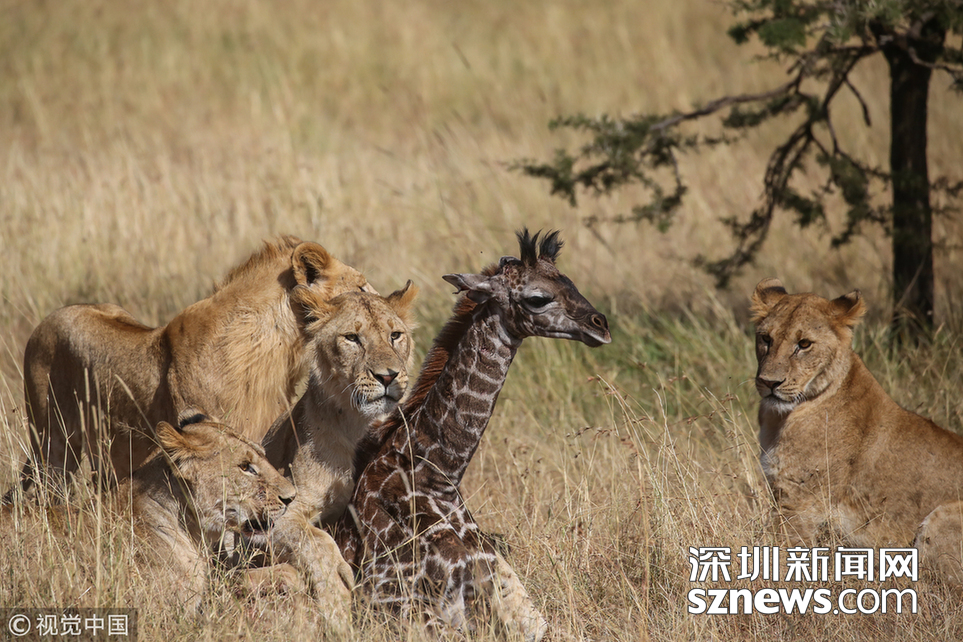 當(dāng)?shù)貢r(shí)間2018年8月15日,肯尼亞馬賽馬拉,當(dāng)?shù)貙?dǎo)游詹姆斯·納帕索(James Nampaso)拍攝到一群獅子圍攻母長(zhǎng)頸鹿和她的幼崽。盡管長(zhǎng)頸鹿勇敢地抵抗獅群的進(jìn)攻,但當(dāng)一頭母獅跳上它的脊背時(shí),它被分散了注意力,使得獅群最終捕獲了它的孩子。
