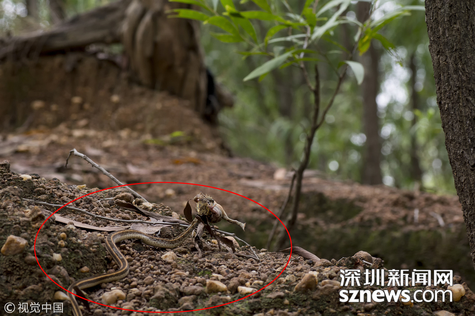印度加爾各答B(yǎng)olpar,業(yè)余攝影師Agniswar Ghosal在Bolpar散步時拍到蛇大口吞咽蟾蜍的震撼場景。一條細長的蛇正試圖整個吞下一只大蟾蜍,蟾蜍的頭已經(jīng)進了蛇口,大半截身體還在外邊。這條野心勃勃的蛇把這只毫無戒心的蟾蜍從洞里拖了出來,然后溜進灌木叢,安靜地享用晚餐。