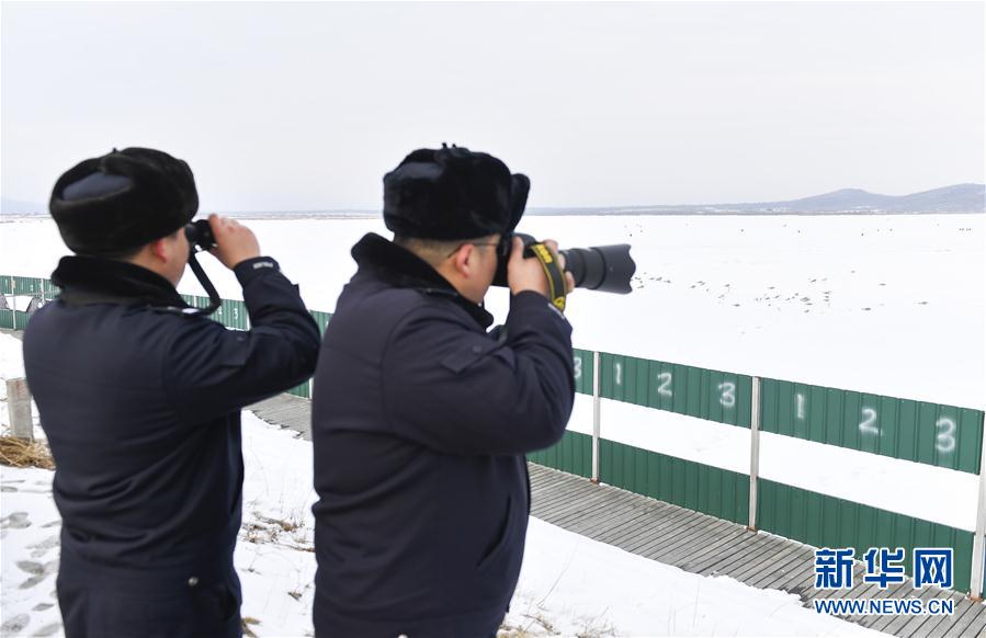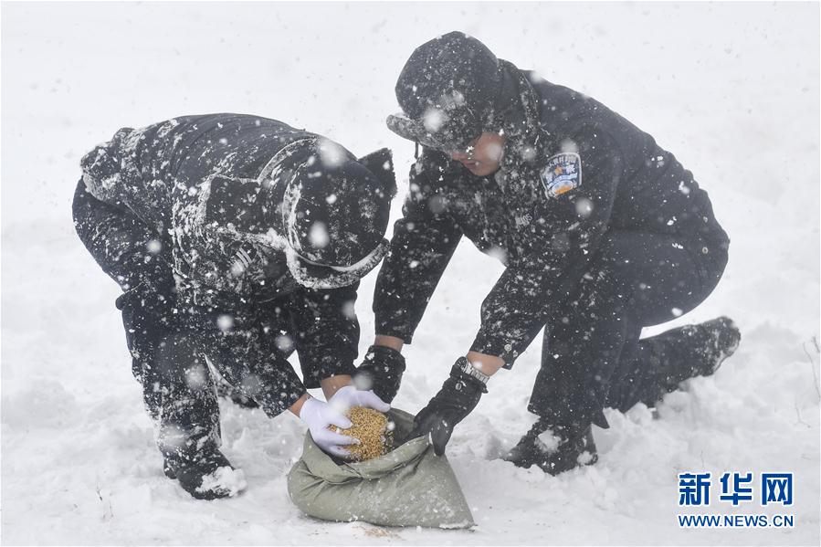 為保障候鳥在敬信濕地逗留期間的安全,琿春森林公安局基層民警奮戰(zhàn)在護(hù)鳥一線,積極加大巡護(hù)力度,在風(fēng)雪天氣為候鳥投放糧食,嚴(yán)打獵捕候鳥違法犯罪,確保候鳥遷徙通道安全。新華社記者 許暢 攝
