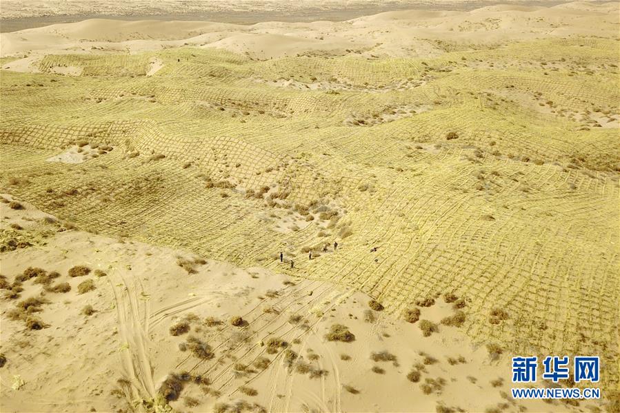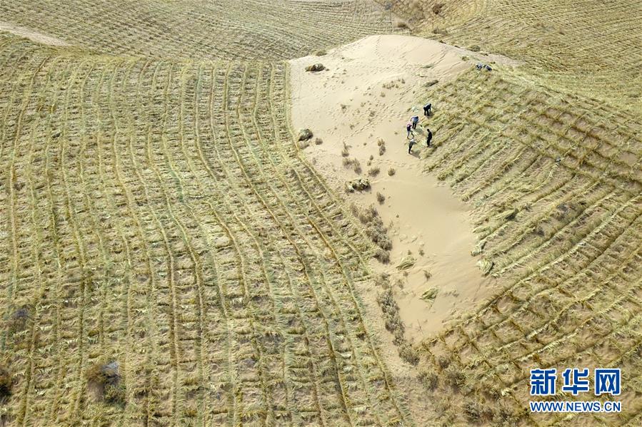 3月5日,在古浪縣北部沙區(qū)旱麻崗治沙點,群眾扎草方格壓沙(無人機照片)。初春時節(jié),在騰格里沙漠南緣的甘肅省武威市古浪縣,當地干部職工及八步沙林場治沙人共同在縣城北部沙區(qū)旱麻崗治沙點開展春季治沙勞動。新華社記者 范培珅 攝